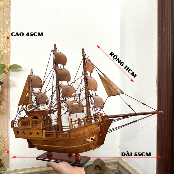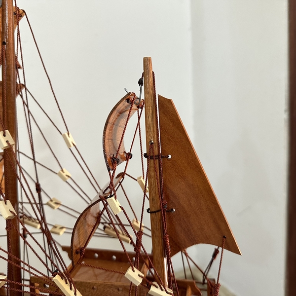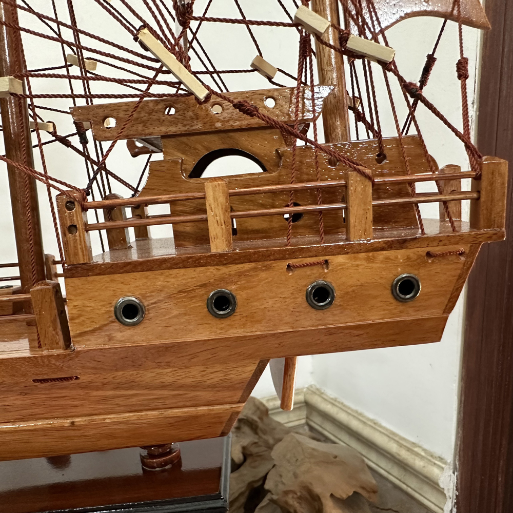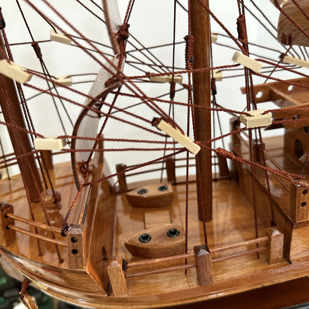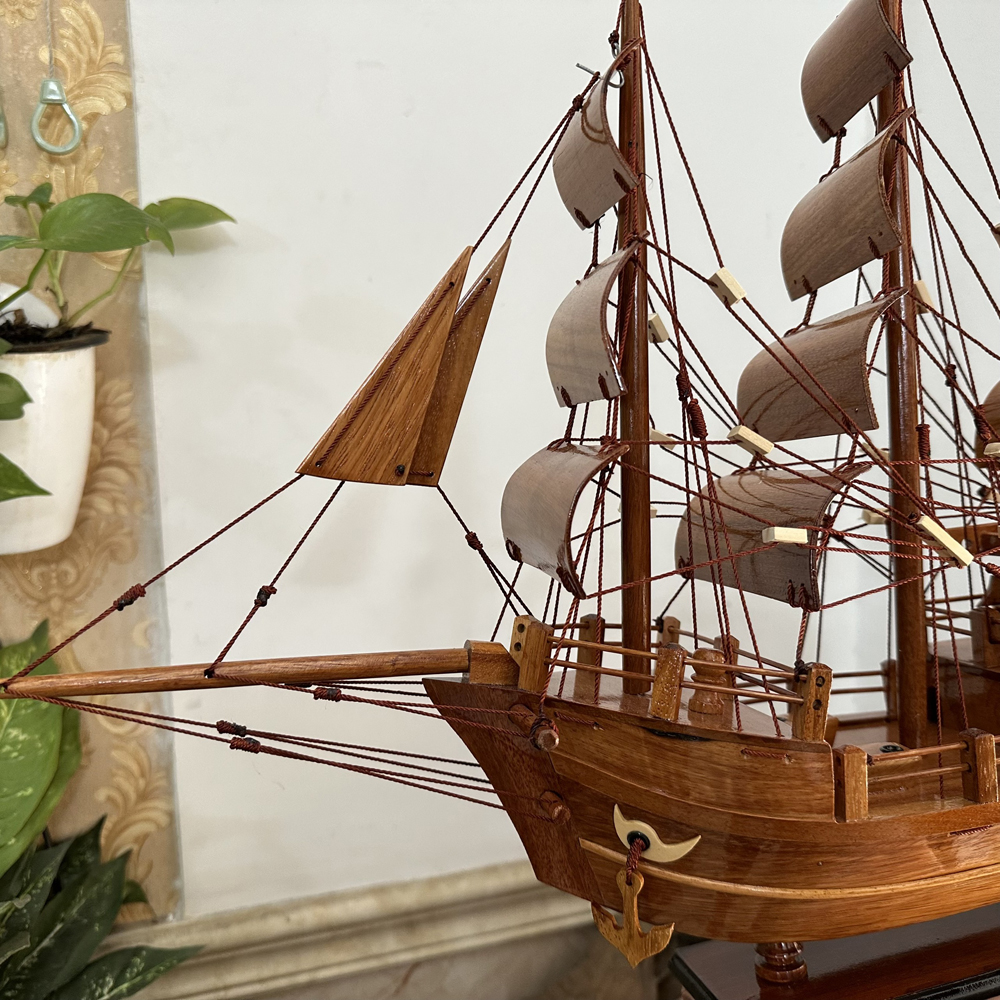 _ Mô hình được thiết kế tỉ mỉ, chắc chắn và được chạm khắc tinh xảo, bắt mắt người xem với chất liệu gỗ tự nhiên cùng với lớp sơn bóng PU không lo mối mọt trong thời gian dài. Hơn nữa các chi tiết, bộ phận như vỏ tàu, thân tàu, boong tàu, cột và cánh buồm, cũng như các trang trí khác.. được thiết kế phù hợp với tỷ lệ mô hình thuyền gỗ này.