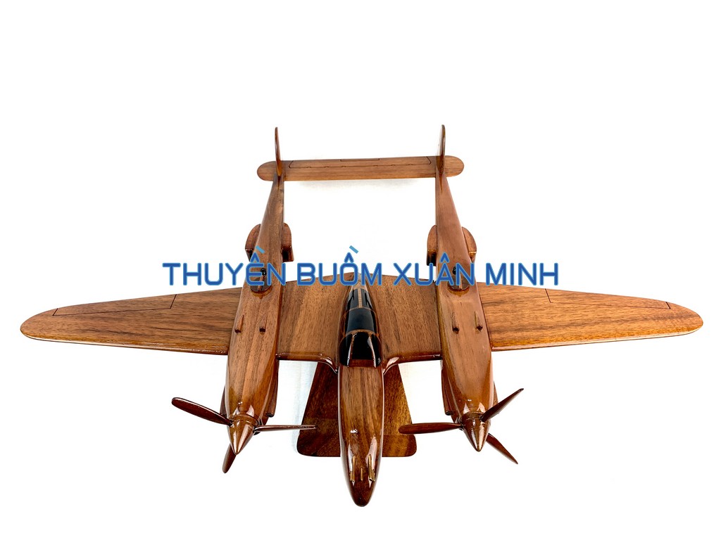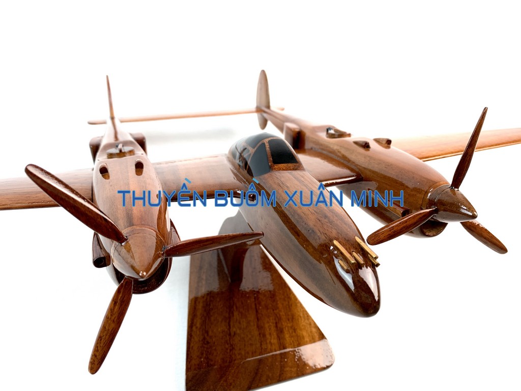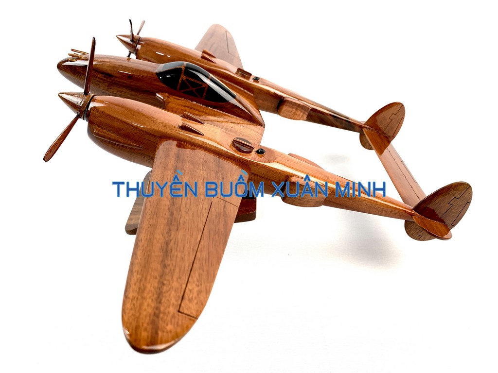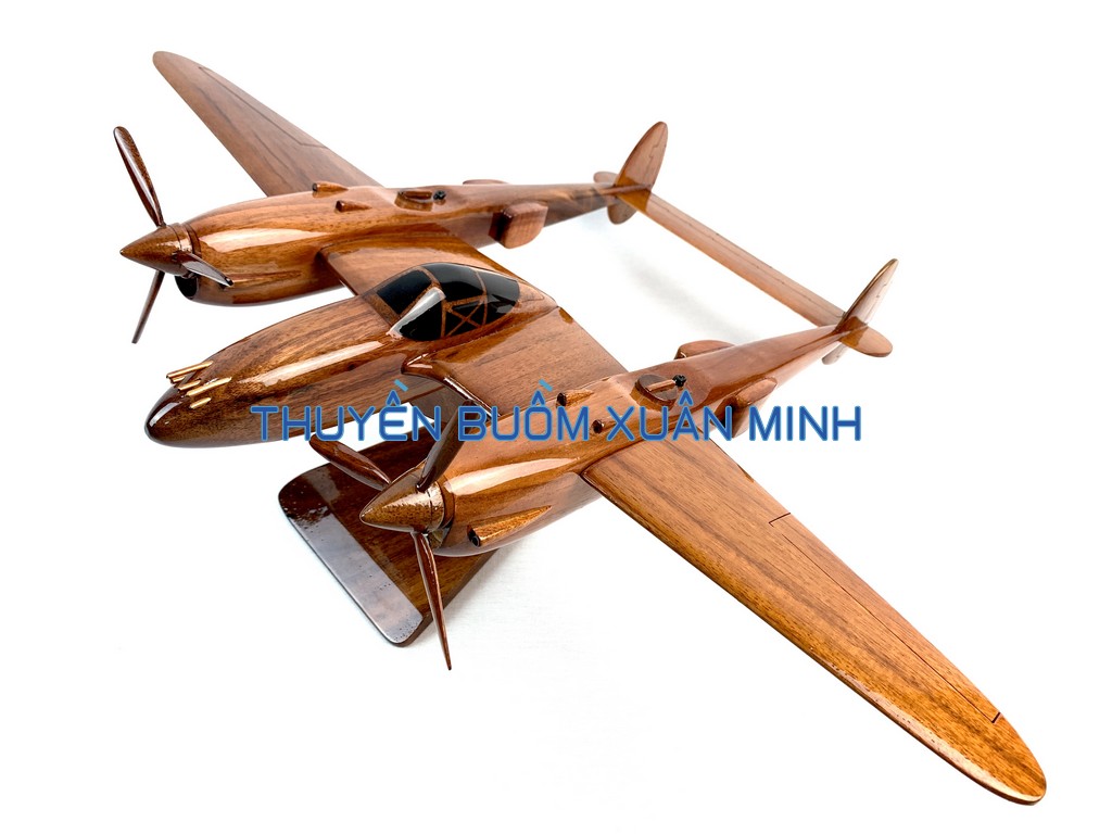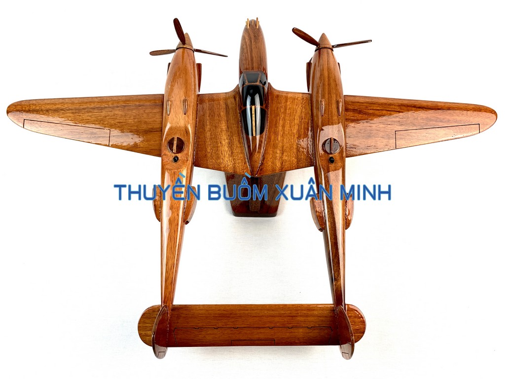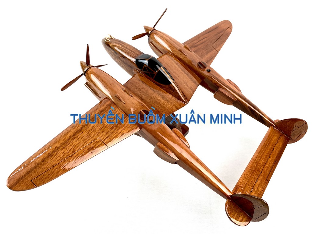 Lockheed P-38 Lightning (Tia Chớp) là máy bay tiêm kích trong CTTG II của Hoa Kỳ. P-38 có cấu trúc đặc biệt với 2 thân dài gắn động cơ phía trước và 1 thân giữa ngắn có khoang lái và vũ khí. Sản phẩm như hình, được thủ công từ gỗ Tràm (Keo) tự nhiên 100% và được sơn bóng PU giúp giữ tone màu gỗ tự nhiên lâu bền