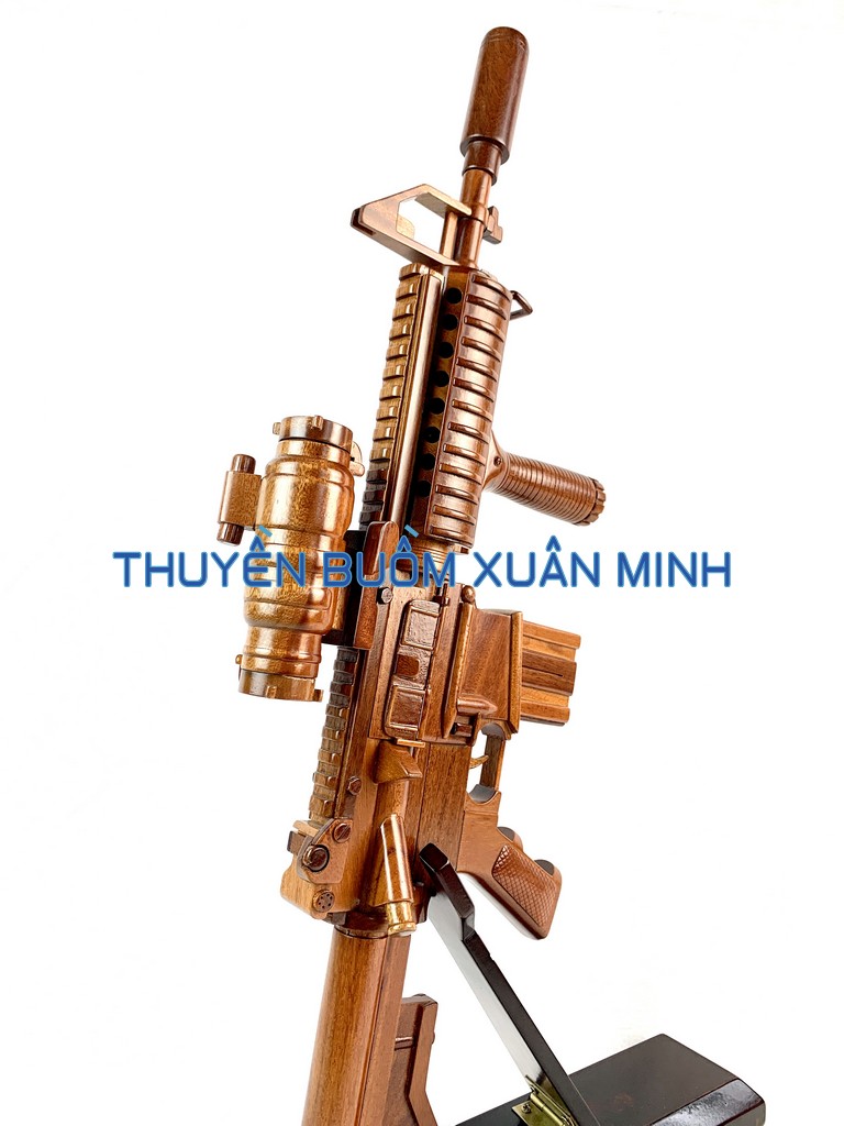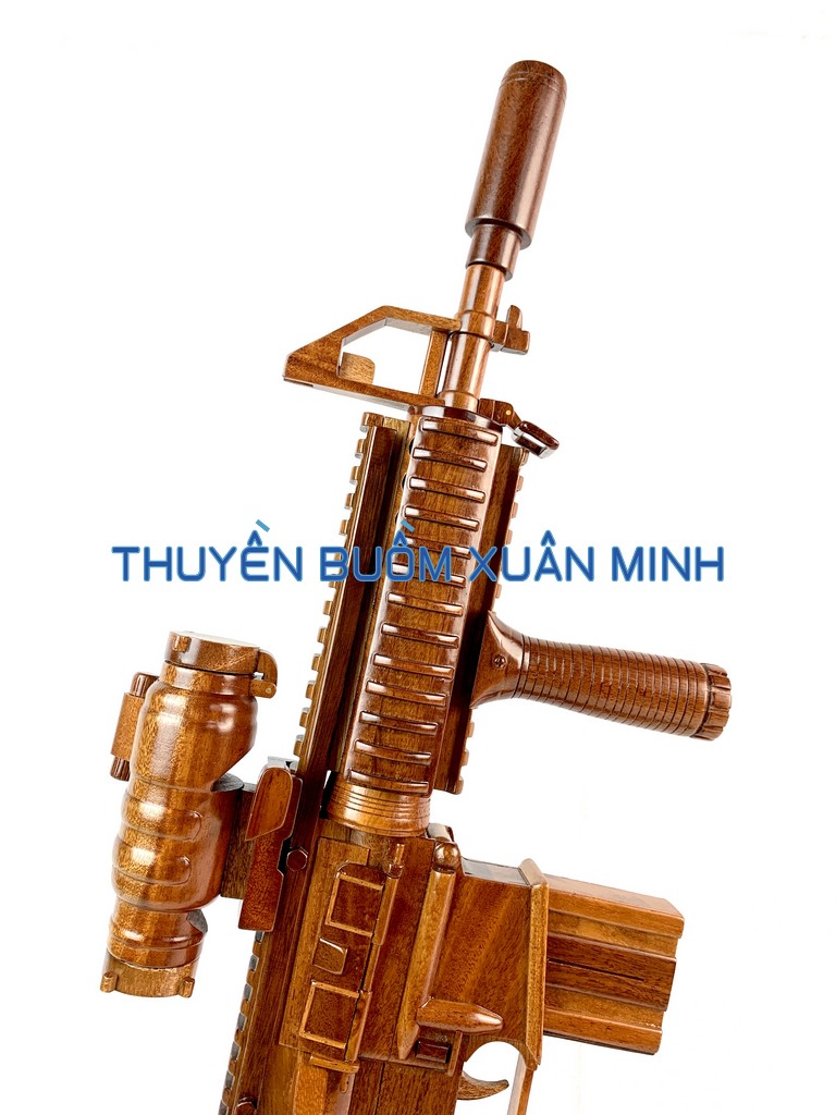 _ Mô hình được thiết kế tỉ mỉ, chắc chắn và được chạm khắc tinh xảo, bắt mắt người xem với chất liệu gỗ tự nhiên cùng với lớp sơn bóng PU không lo mối mọt trong thời gian dài. Hơn nữa các chi tiết như nòng súng, ống nhắm, ruồi nhắm, băng đạn, tay cầm, báng súng cũng như các trang trí khác.. được thiết kế phù hợp với tỷ lệ mô hình súng gỗ này.