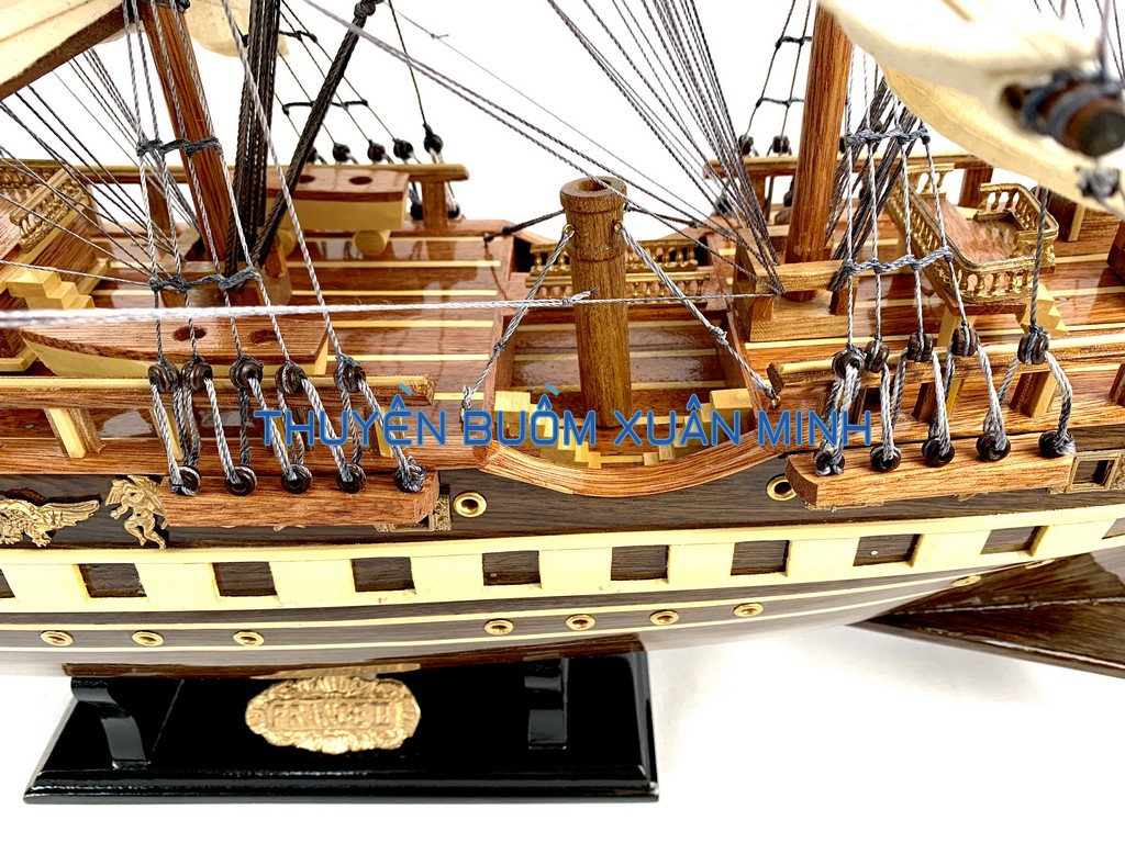 _ Mô hình được thiết kế tỉ mỉ, chắc chắn và được chạm khắc tinh xảo, bắt mắt người xem với chất liệu gỗ tự nhiên cùng với lớp sơn bóng PU không lo mối mọt trong thời gian dài. Hơn nữa các chi tiết, bộ phận như vỏ tàu, thân tàu, boong tàu, cột và cánh buồm, cũng như các trang trí khác.. được thiết kế phù hợp với tỷ lệ mô hình thuyền gỗ này.