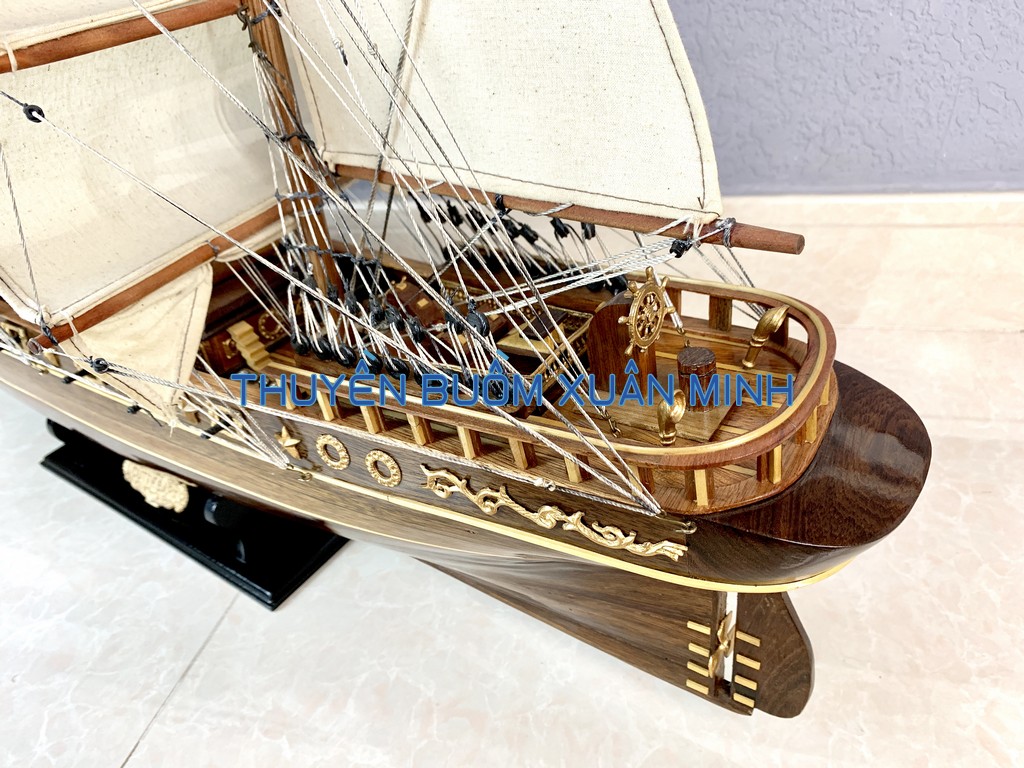 _ Mô hình được thiết kế tỉ mỉ, chắc chắn và được chạm khắc tinh xảo, bắt mắt người xem với chất liệu gỗ tự nhiên cùng với lớp sơn bóng PU không lo mối mọt trong thời gian dài. Hơn nữa các chi tiết, bộ phận như vỏ tàu, thân tàu, boong tàu, cột và cánh buồm, cũng như các trang trí khác.. được thiết kế phù hợp với tỷ lệ mô hình thuyền gỗ này.
