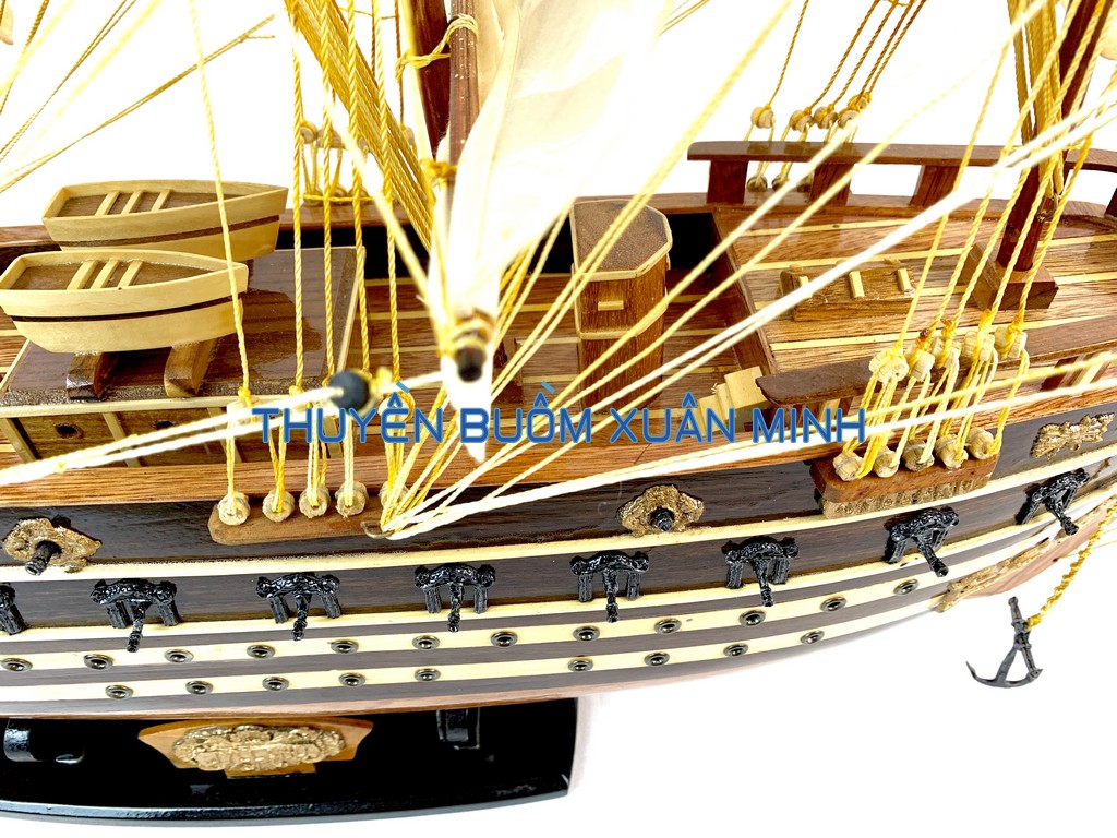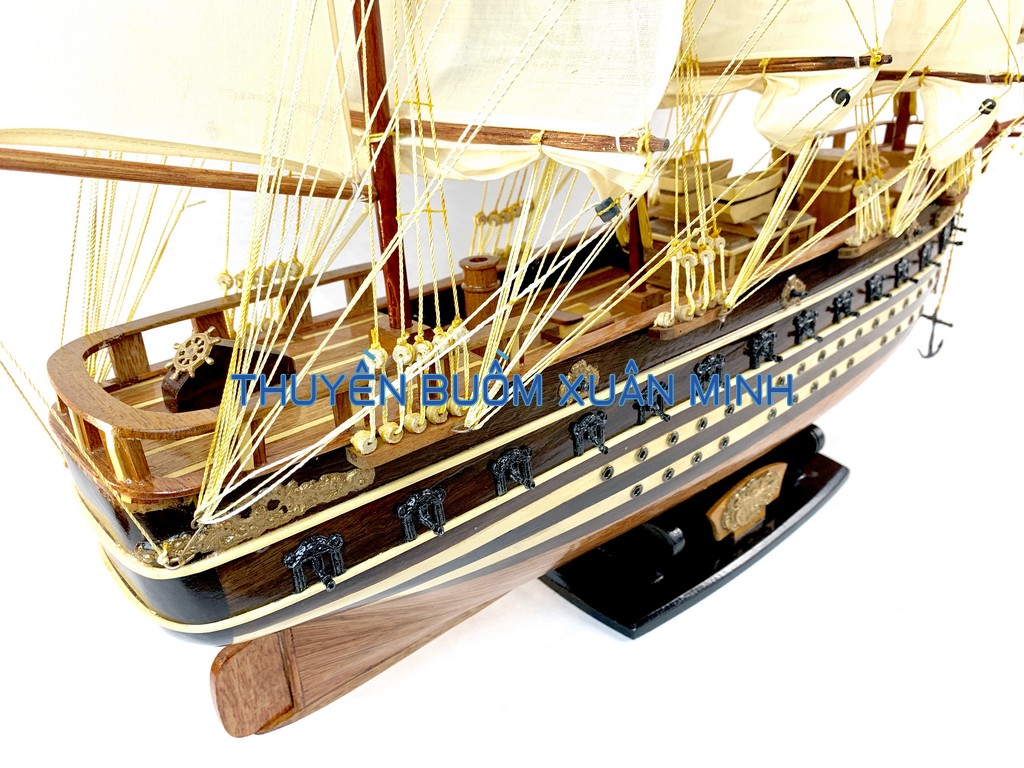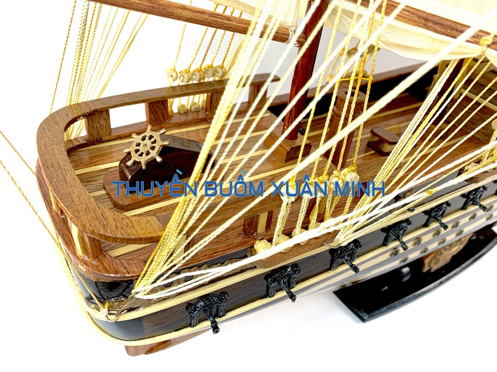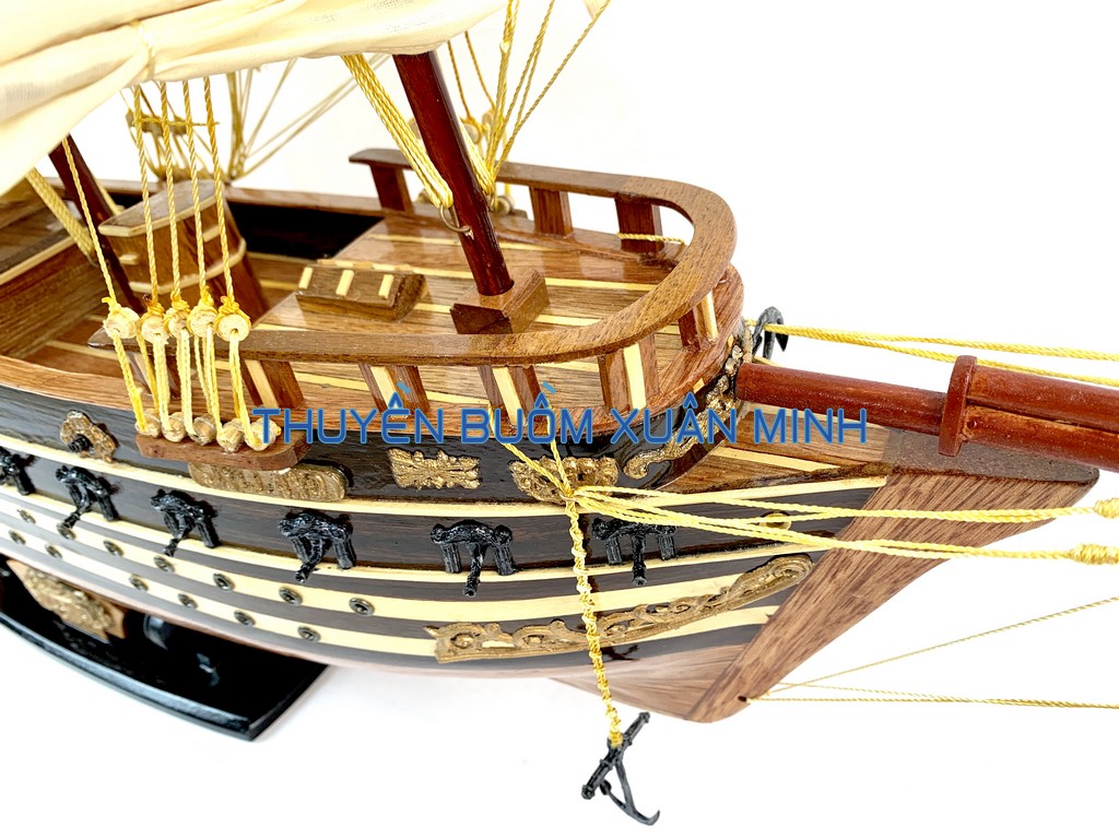_ Mô hình được thiết kế tỉ mỉ, chắc chắn và được chạm khắc tinh xảo, bắt mắt người xem với chất liệu gỗ tự nhiên cùng với lớp sơn bóng PU không lo mối mọt trong thời gian dài. Hơn nữa các chi tiết, bộ phận như vỏ tàu, thân tàu, boong tàu, cột và cánh buồm, cũng như các trang trí khác.. được thiết kế phù hợp với tỷ lệ mô hình thuyền gỗ này.