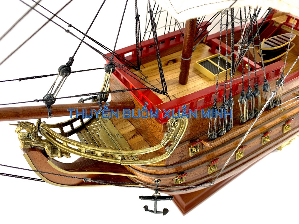_ Mô hình được thiết kế tỉ mỉ, chắc chắn và được chạm khắc tinh xảo, bắt mắt người xem với chất liệu gỗ tự nhiên cùng với lớp sơn bóng PU không lo mối mọt trong thời gian dài. Hơn nữa các chi tiết, bộ phận như vỏ tàu, thân tàu, boong tàu, cột và cánh buồm, cũng như các trang trí khác.. được thiết kế phù hợp với tỷ lệ mô hình thuyền gỗ này.