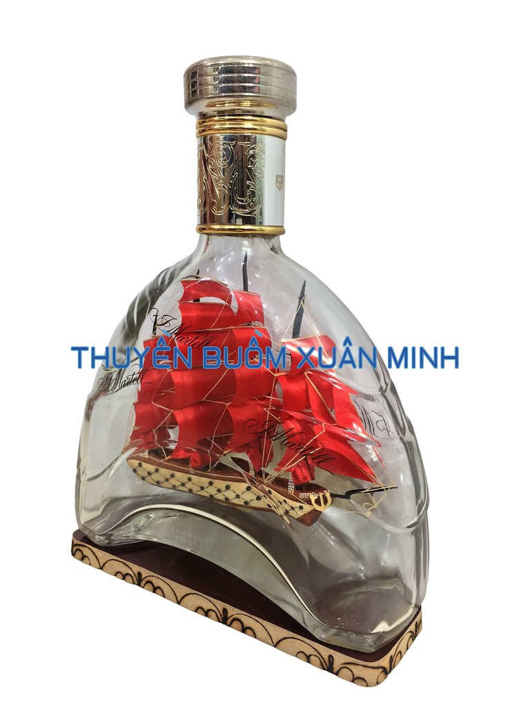 + 01 Mô Hình Thuyền Gỗ Trong Chai Rượu Martell X.O - A3, xuất xứ Việt Nam.